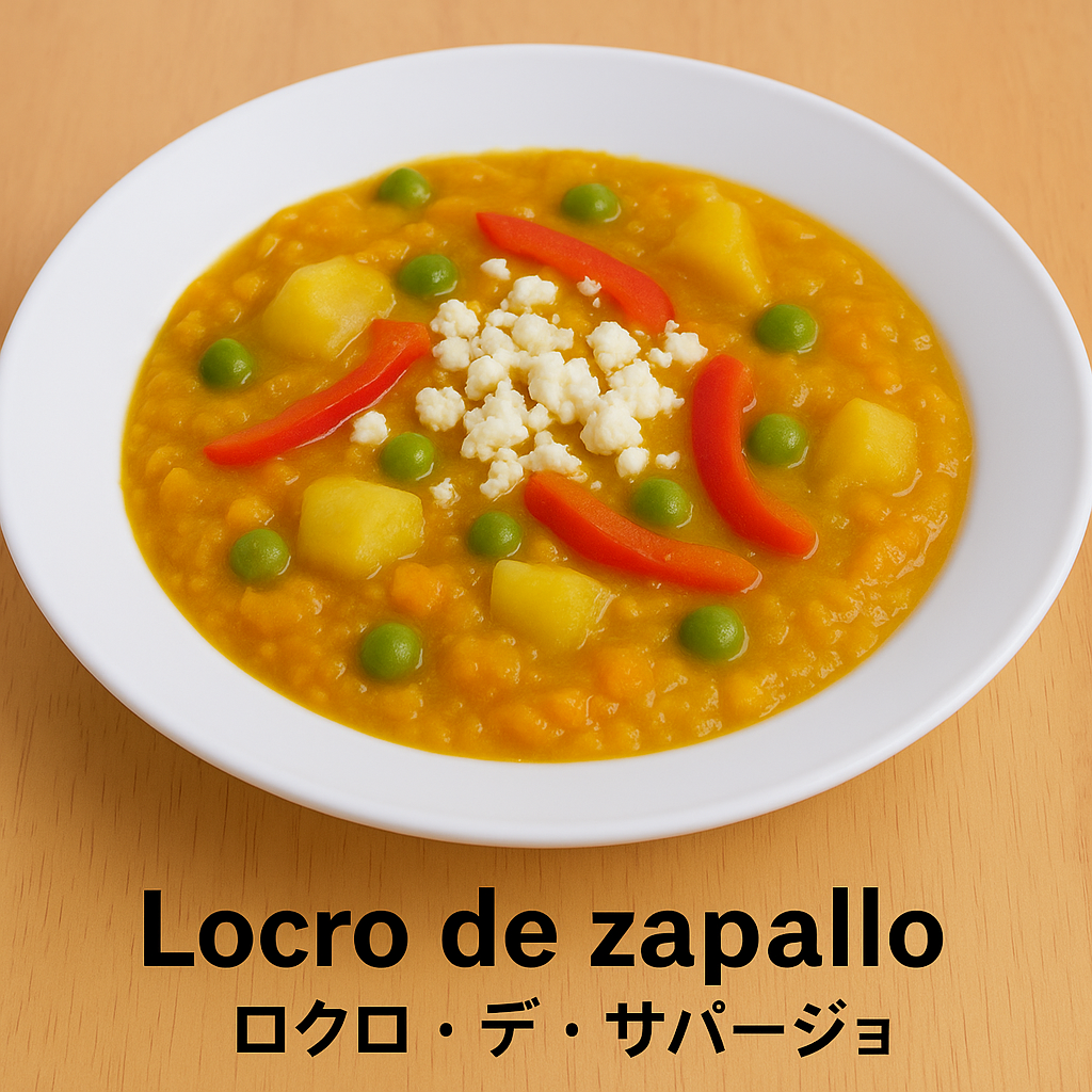 Locro de zapallo(ロクロ・デ・サパージョ) は、ペルーのアンデス地方を代表する家庭料理のひとつです。「Locro」とは南米で広く食べられるシチューのことで、かぼちゃ(zapallo〔サパージョ〕)をベースに、じゃがいもやトウモロコシ、チーズを加えて煮込んだ、素朴で温かい味わいの一皿です。古代インカ時代から食べられてきた伝統料理であり、家庭ごとに具材や味付けに違いがあるのも特徴です。日本の栗かぼちゃを使えば、ホクホク感と甘みが引き立ち、食べ応えのあるスープに仕上がります。
