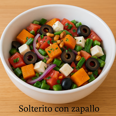 Solterito(ソルテリート) は、ペルー南部アレキパ地方の伝統的なサラダです。そら豆やチーズ、トマト、トウモロコシ、オリーブなどを彩りよく混ぜ合わせ、オリーブオイルとライムで味付けした爽やかな一皿です。家庭料理としても祭りの料理としても親しまれており、野菜や豆の組み合わせは地域や家庭によって少しずつ異なります。